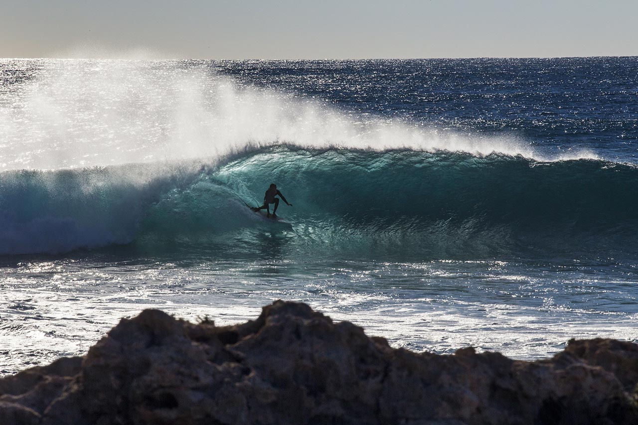 “Are you sure we won’t get stuck in the sand here?”, Sofia asks me nervously as we trot in two-wheel drive down a winding road through the rolling dunes of the Quobba station outback. Somewhere in the distance the Indian Ocean is calling, salt saturating the desert air and flashes of blue horizon luring us closer to the end of the road. Rumors of a world class pointbreak has brought us and our surfboards here, and my intuition tells me we’re getting closer, every bend and rollover making me stretch my neck in the hope of finally seeing what I’m silently praying to discover. Just as our poor Toyota is about to sink into the increasingly deeper sand for a final resting place, we make it over one last knoll before our destination is revealed. In front of us a majestic bay stretches out, sapphire-blue waves crashing on sparkling sand, and a reeling lefthand pointbreak rolling down the far end, the offshore spray grooming the swell lines to perfection. At this point I’m having a hard time focusing on the road as we roll into the Red Bluff camping community. In the center of a handful of campgrounds scattered along the beach is a tiny general store/surf shop/pizza restaurant, run by a friendly local woman and her five sons and daughters, all miniature replicas of herself, sun-bleached hair and a deep golden surf tan from countless hours spent in the surf. We get allotted a private space on the far end of the beach where we set up camp for the next two nights, unknowing that they will turn to three, then four and eventually five, in this little slice of paradise. The following days turn into a timeless blur of surfing, sleeping, drinking beer around the fire, and watching the humpback whales migrate in the hundreds on their way north along the coast. These majestic creatures are constantly present, sometimes breaching the surface just outside the surf line-up, providing delightful entertainment in between waves.